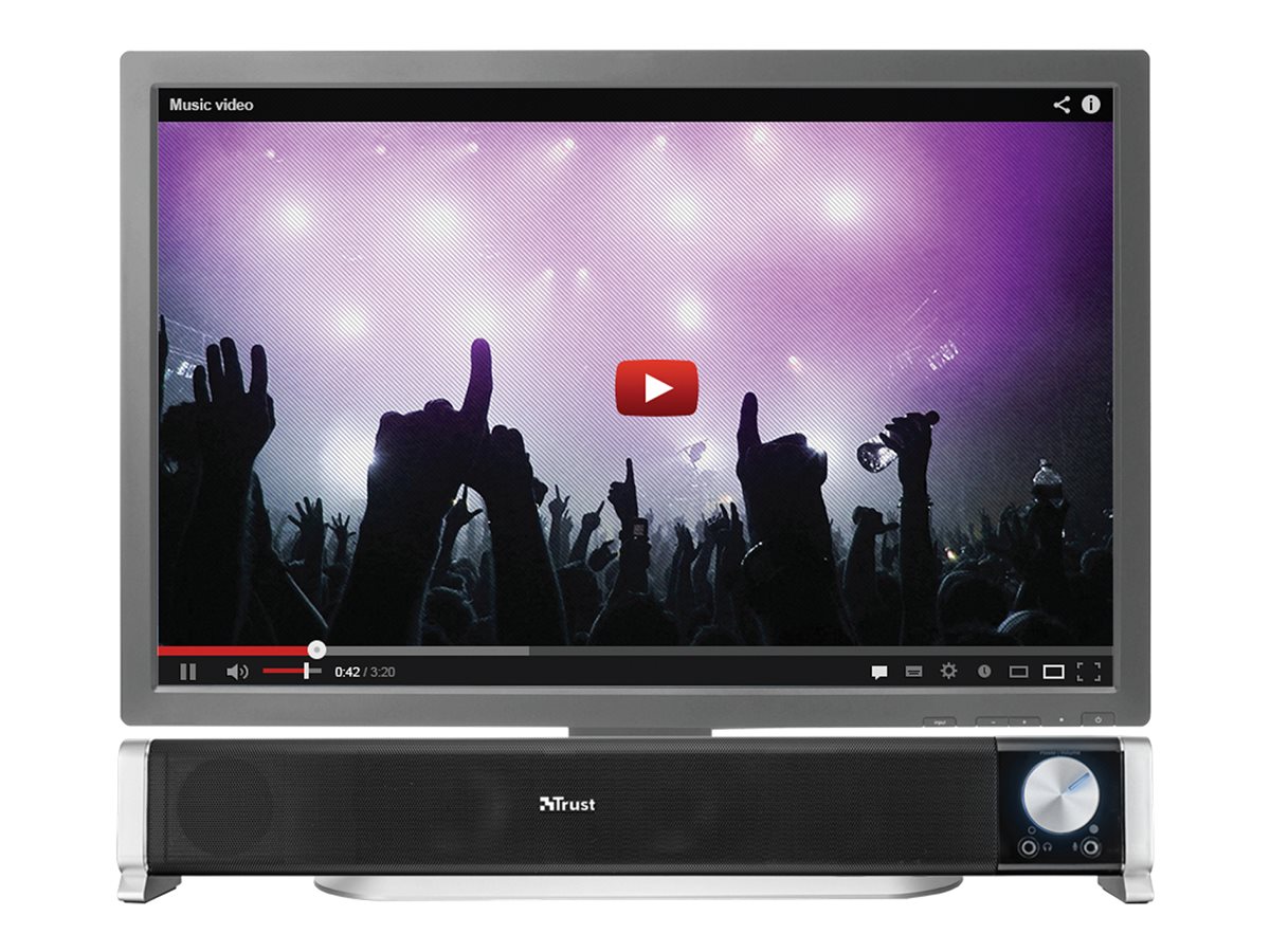 Trust Asto. Potencia estimada RMS: 6 W, Salida de pico de potencia musical (PMPO): 12 W. Potencia de la barra de sonido del altavoz RMS: 6 W. Color del producto: Negro, Plata, Uso recomendado: PC. Tecnología de conectividad: Alámbrico. Ancho: 470 mm, Profundidad: 75 mm, Altura: 70 mm