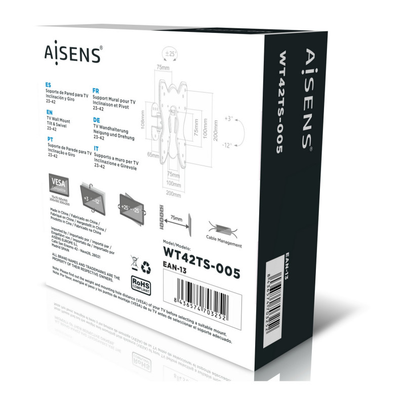 AISENS WT42TS-005. Capacidad máxima de peso: 25 kg, Tamaño mínimo de pantalla: 58,4 cm (23"), Tamaño máximo de pantalla: 106,7 cm (42"), Compatibilidad con interfaz de montaje (min): 75 x 75 mm, Compatibilidad con interfaz de montaje (max): 200 x 200 mm. Ángulo de inclinación: -12 - 3°, Ángulo de rotación: 50°, Distancia a la pared (max): 7,5 cm. Color del producto: Negro