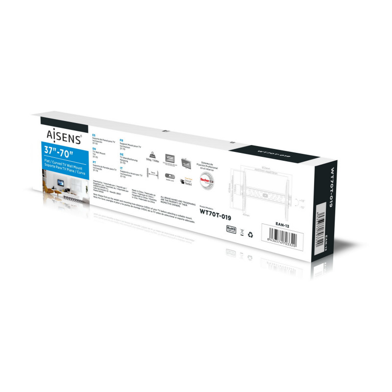 AISENS WT70T-019. Capacidad máxima de peso: 50 kg, Tamaño mínimo de pantalla: 94 cm (37"), Tamaño máximo de pantalla: 177,8 cm (70"), Compatibilidad con interfaz de montaje (min): 200 x 200 mm, Compatibilidad con interfaz de montaje (max): 600 x 400 mm. Ángulo de inclinación: -15 - 10°. Color del producto: Negro