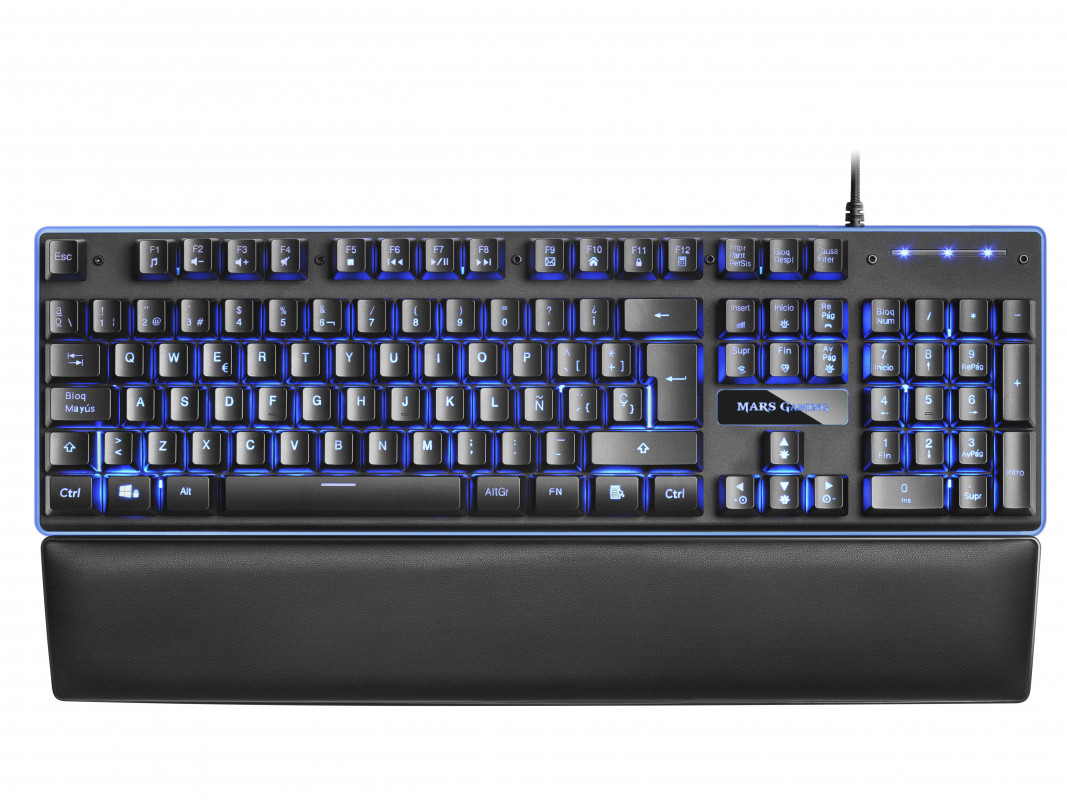Mars Gaming MK320ES. Formato del teclado: Full-size (100%). Estilo de teclado: Derecho. Interfaz del dispositivo: USB, Interruptor del teclado: Interruptor mecánico, Diseño de teclado: QWERTY. Tipo de retroiluminación: LED RGB, Descansa muñecas. Longitud de cable: 1,5 m. Uso recomendado: Juego. Color del producto: Negro