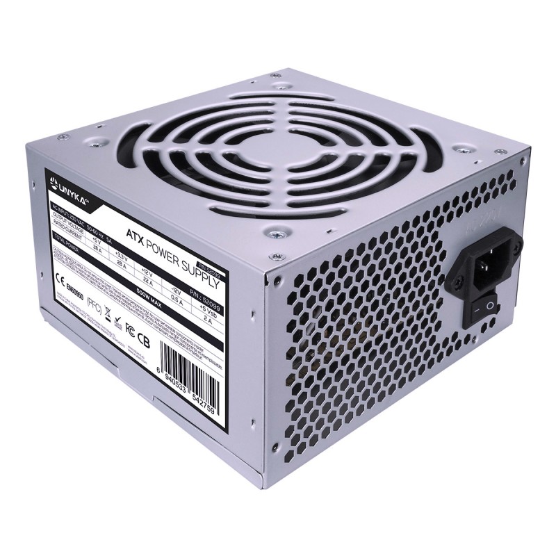 UNYKAch ATX 500W. Potencia total: 500 W, Voltaje de entrada AC: 230 V, Frecuencia de entrada AC: 50 - 60 Hz. Alimentador de energía para tarjeta madre: 20+4 pin ATX, Longitud del cable de alimentación de la placa base: 31 cm, Longitud del cable de alimentación SATA: 300,480 mm. Utilizar con: PC/servidor, Factor de forma de fuente de alimentación (PSU): ATX, Formas de factor de tarjeta madre soportadas: ATX. Color del producto: Plata, Diámetro de ventilador: 12 cm, Número de ventiladores: 1 Ventilador(es). Ancho: 150 mm, Profundidad: 140 mm, Altura: 85 mm