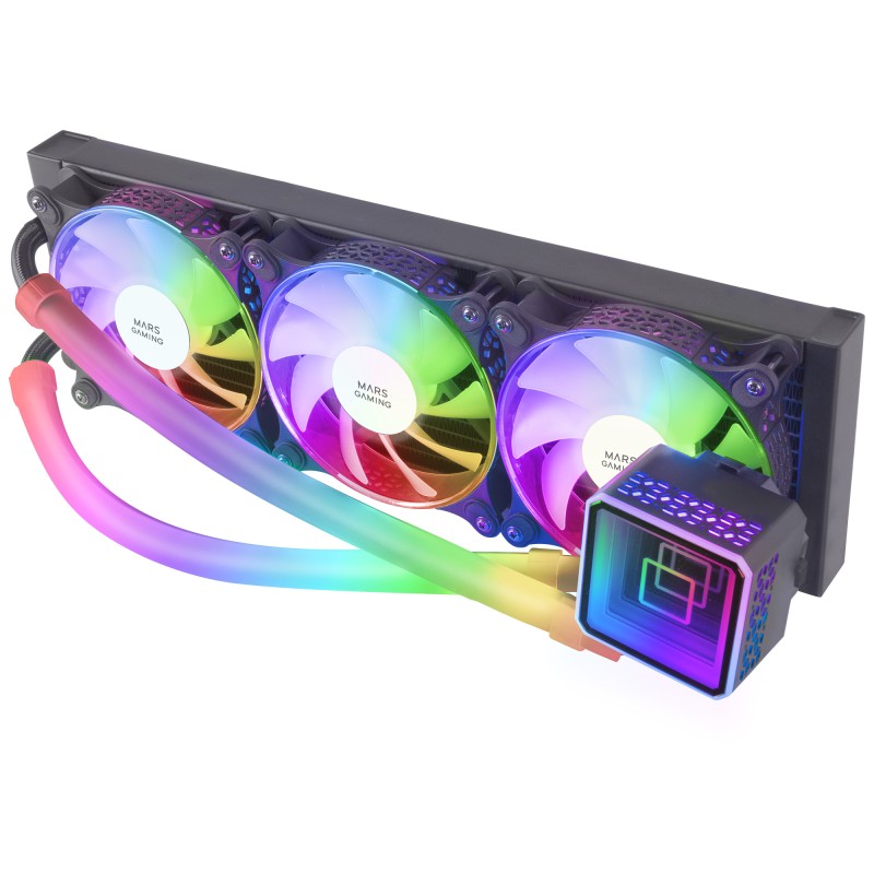 Mars Gaming ML-ULTRA360 Negro, Refrigeración Líquida CPU, TDP 650W, Espejo Infinito, 3 Ventiladores Silenciosos FDB ARGB, Tubos ARGB, Multisocket Universal. Tipo: Kit de refrigeración líquida, Diámetro de ventilador: 12 cm, Tipo de soporte: Hidráulico. Color del producto: Negro