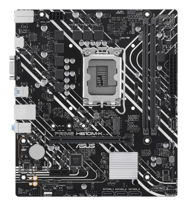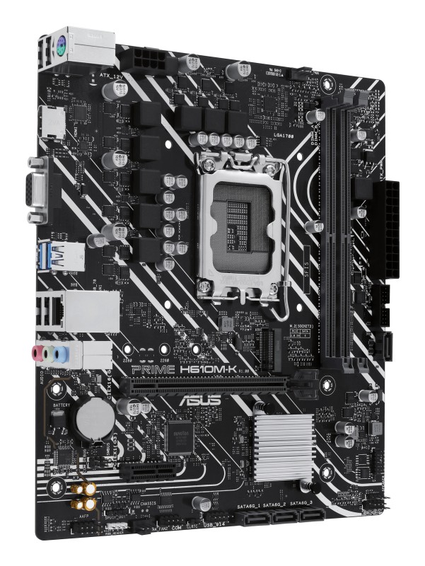 ASUS Prime H610M-K. Fabricante de procesador: Intel, Socket de procesador: LGA 1700, Procesador compatible: Intel Celeron, Intel Core i3, Intel Core i5, Intel Core i7, Intel Core i9,.... tipos de memoria compatibles: DDR5-SDRAM, Memoria interna máxima: 96GB, Tipo de ranuras de memoria: DIMM. Interfaces de disco de almacenamiento soportados: M.2, SATA III, Tipos de unidades de almacenamiento admitidas: HDD & SSD. Conector USB: USB tipo A. Tipo de interfaz ethernet: Gigabit Ethernet