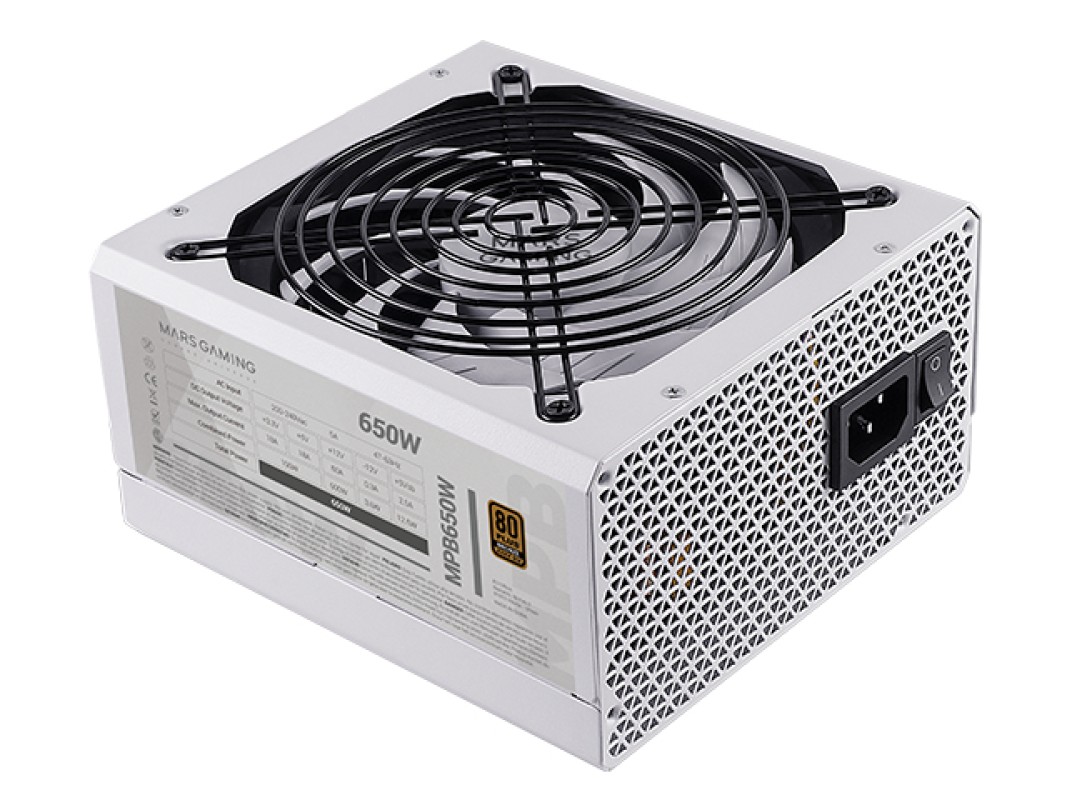 Mars Gaming MPB650, Fuente Alimentación PC ATX 650W, 6 Años Garantía, 80Plus Bronze 230V, Ventilador 140mm FDB con Tecnología Silenciosa AI-RPM, 90% Eficiencia, Blanco. Potencia total: 650 W, Voltaje de entrada AC: 200 - 240 V, Frecuencia de entrada AC: 47 - 63 Hz. Alimentador de energía para tarjeta madre: 24-pin ATX, Tipo de cableado: No modular. Utilizar con: PC, Factor de forma de fuente de alimentación (PSU): ATX, Certificación 80 PLUS: 80 PLUS Bronze. Color del producto: Blanco, Tipo de enfriamiento: Activo, Diámetro de ventilador: 14 cm. Certificados de conformidad: CE, RoHS