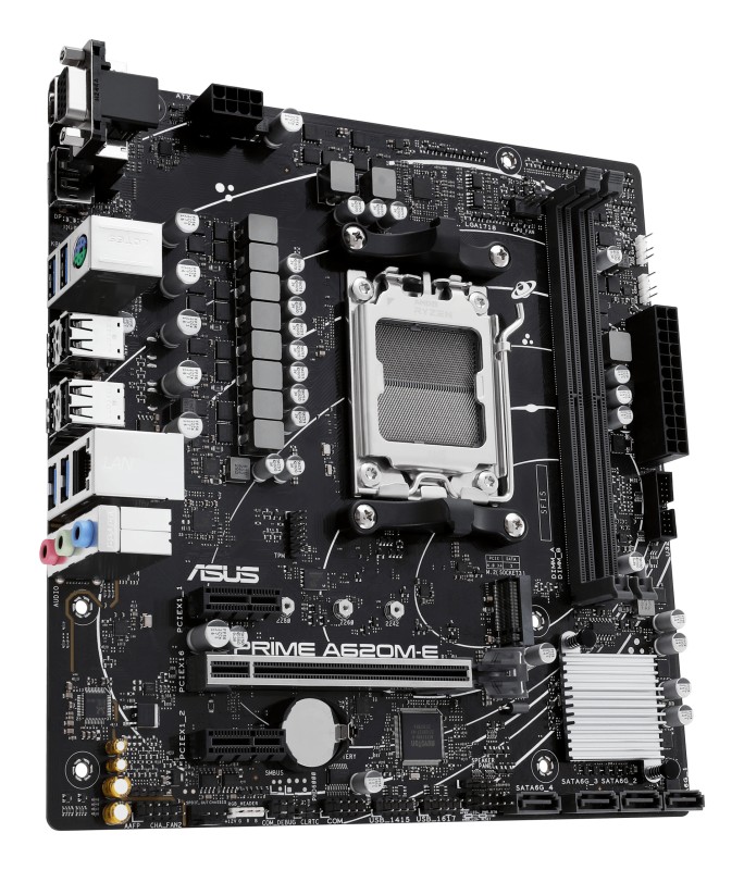 ASUS PRIME A620M-E-CSM. Fabricante de procesador: AMD, Socket de procesador: Zócalo AM5, Procesador compatible: AMD Ryzen 7000 Series. tipos de memoria compatibles: DDR5-SDRAM, Memoria interna máxima: 96GB, Tipo de ranuras de memoria: DIMM. Interfaces de disco de almacenamiento soportados: M.2, SATA III, Tipos de unidades de almacenamiento admitidas: HDD & SSD, Niveles RAID: 0, 1, 10. Tipo de interfaz ethernet: Gigabit Ethernet. Componente para: PC, Factor de forma: micro ATX, Familia del chipset: AMD