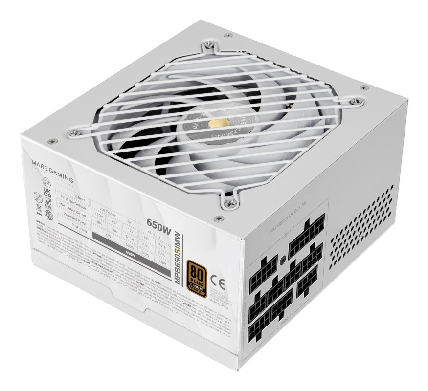 Mars Gaming MPB650SIMW. Potencia total: 650 W, Voltaje de entrada AC: 200 - 240 V, Frecuencia de entrada AC: 47 - 63 Hz. Alimentador de energía para tarjeta madre: 24-pin ATX, Longitud del cable de alimentación de la placa base: 50 cm, Tipo de cableado: Totalmente modular. Utilizar con: PC, Factor de forma de fuente de alimentación (PSU): ATX, Certificación 80 PLUS: 80 PLUS Bronze. Color del producto: Blanco, Tipo de enfriamiento: Activo, Diámetro de ventilador: 12 cm. Certificados de conformidad: CE, RoHS