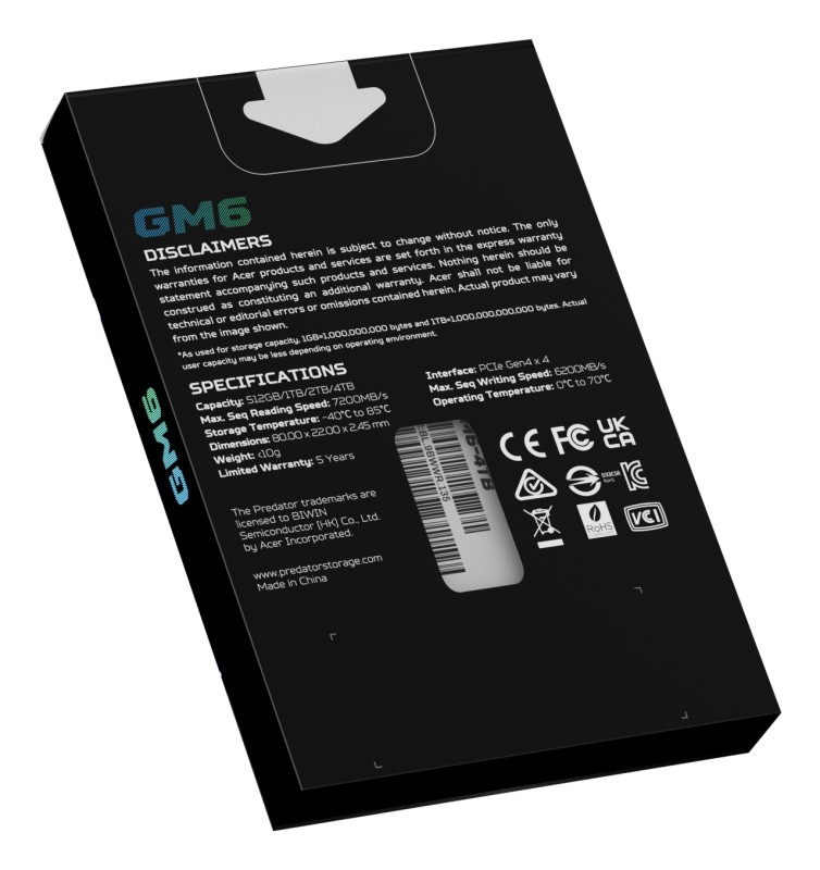 Predator GM6-2TB. SDD, capacidad: 2TB, Factor de forma de disco SSD: M.2, Velocidad de lectura: 7200 MB/s, Velocidad de escritura: 6200 MB/s, Componente para: PC/ordenador portátil