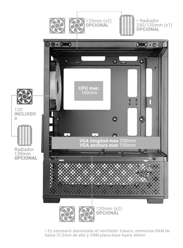 Diámetro de ventiladores inferiores secundarios soportados 120 | 120 |